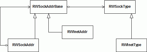 Figure 8 shows the hierarchy of the socket address classes. The classes on the left, derived from RWSockAddrBase, represent the addresses themselves. The classes on the right, derived from RWSockType, represent address types.