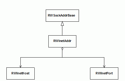 An internet address is represented in the Networking package as an RWInetAddr. As shown in Figure 10, an RWInetAddr object contains two objects: an RWInetHost to represent the host, and an RWInetPort to represent the port.