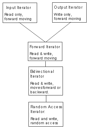 Iterators are a generalization of pointers that allow a C++ program to uniformly interact with different data structures. The illustration below displays the five iterator categories defined by the standard library, and shows their heirarchical relationship. Because standard library iterator categories are hierarchical, each category includes all the requirements of the categories above it.