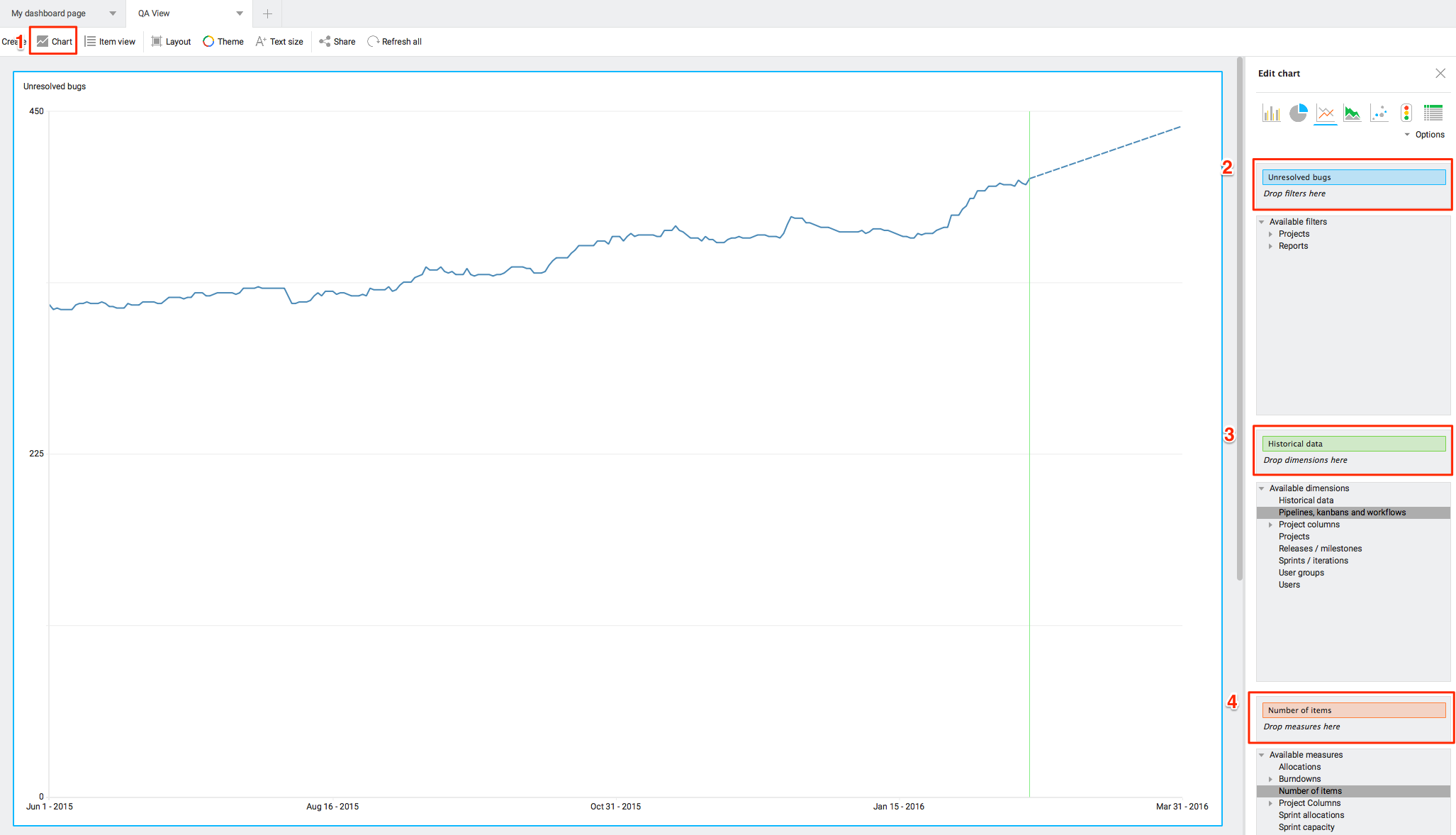 4. Add Number of Items as the measure to track how many bugs that are open.