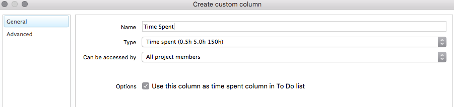 - Name the new column Time Spent (or Actual for example). Make sure it is of the type Time Spent and that you select the option that users can update it from their To Do List.