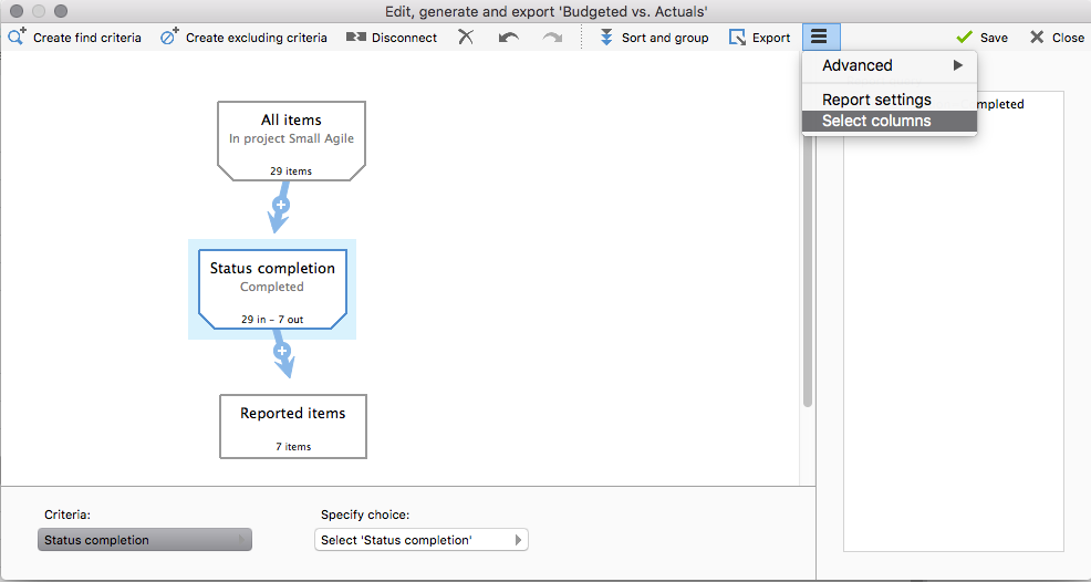 4. Add the criteria that Status Completion = Completed so that we are just looking at items that are completed and we know that Actuals are final.