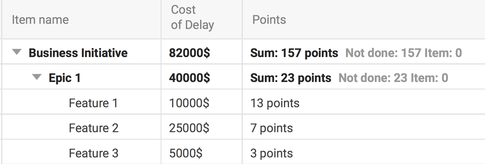 Let's look at an example where we have a column where we give a monetary value to our 'Cost of Delay' as well are using Points to estimate the size: