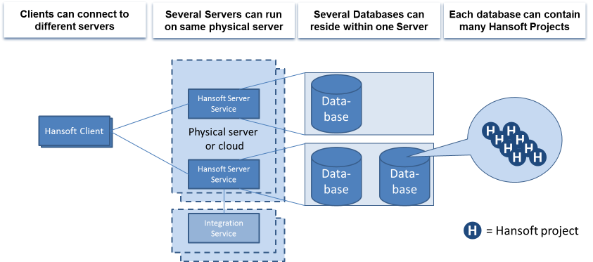 A P4 Plan server can host one or more databases. The P4 Plan database appears in a folder system in the host file system and contains all information related to the projects created in this database including stored documents and historical data. Usually there is one database per organizational unit. Using more than one database per server can be beneficial for distributing work over multiple CPUs/Cores, but this gain in server work efficiency will have to be weighed against having different projects separated, which is not always beneficial.