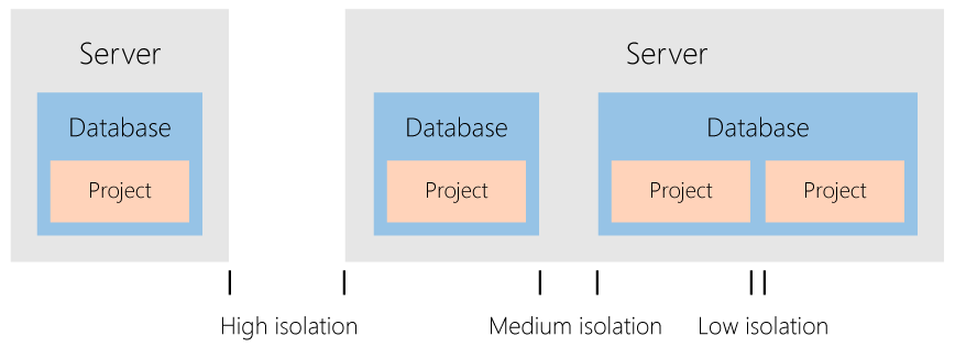 By separating data between different projects in the same database you can control the isolation through the user management within the client. By keeping the project data separated between databases but on the same server a higher level of isolation is achieved as there may be different database administrator passwords and that they are not stored in the same file on disk. However, the highest level of isolation is achieved by also separating the servers from each other.