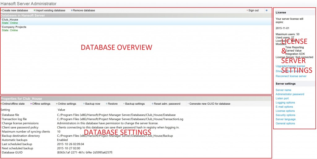 The bottom left panel displays the settings for the currently selected database while the panels on the right allows for configuring the server and licenses.