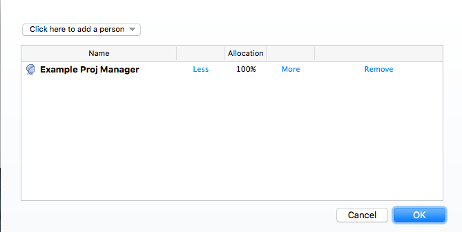 Here you can assign users to the item by selecting them from the Click here to add a person drop-down list. You can also change the allocation of a user on a task by clicking the More and Less buttons, or by directly specifying allocation in the edit field.