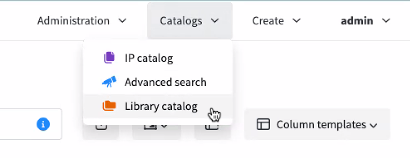The Library catalog page shows the Library catalog and lists the Libraries in IPLM Web. Open the Library catalog page from the top menu bar, Catalogs -> Library catalog link. Libraries can also be used to filter the IP Catalog.