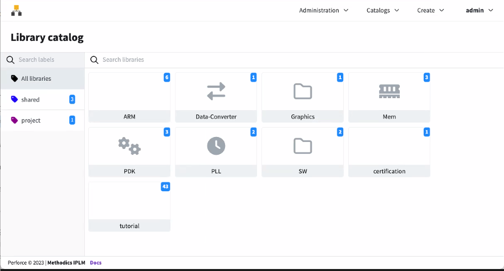 View the Library catalog on IPLM Web or use the 'pi lib list' command from IPLM CLI. This section describes the options for listing Libraries within the Perforce IPLM platform.