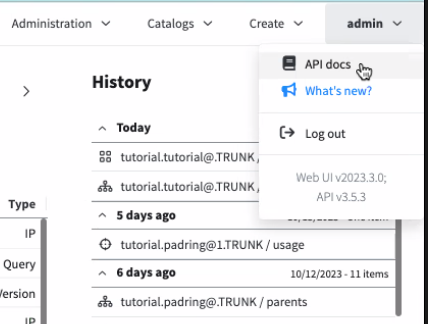 The Perforce IPLM API is used for automation and integration with other systems. Documentation on the API is available through the 'API Docs' menu item on the dropdown menu associated with the logged in user on IPLM Web in the top banner display.