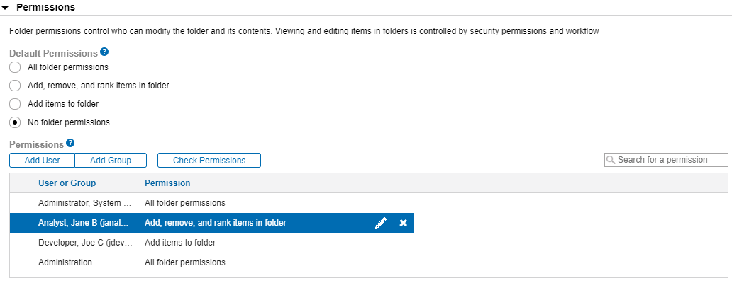 Action | All folder permissions | Add, remove, and rank items in folder | Add items in folder | No permissions |