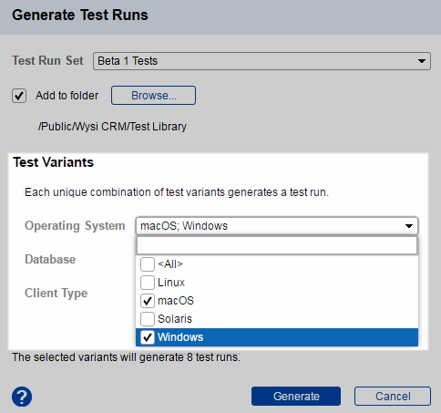 For example, you are testing an application supported on Windows, Mac, and Linux operating systems. You only want to test on Windows and Mac. A variant named Operating System includes values for each supported operating system. When generating manual test runs, select the Windows and Mac variant values so manual test runs are only generated for those operating systems. Each manual test run includes identical information except for the variant value, which indicates the operating system to perform the test on.