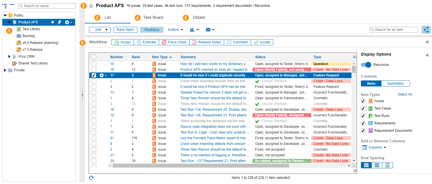 Workflow bar | Available workflow events you can add to items. Available on the List and Task Board tabs. |