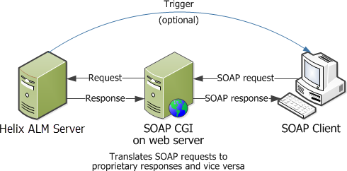 When a SOAP message is sent from a client computer, it is accepted and processed by the web server hosting the Helix ALM SOAP CGI before it is passed to the Helix ALM Server. The response is returned to the client using the same path. An automated SOAP trigger works the same way. If the message is configured to send a response, the Helix ALM SOAP CGI sends the appropriate encoded responses back to the SOAP client.