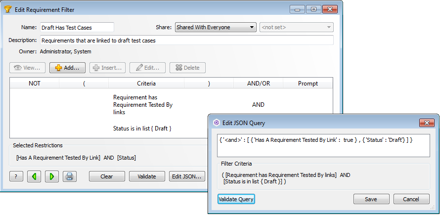 1. In the Helix ALM Client, add restrictions to a filter or advanced find and then click Edit JSON.