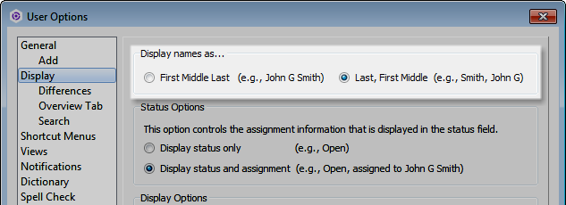 For name fields, you must use the same format selected in the Display user options in the Helix ALM Client for the logged in user. Choose Tools > User Options and then select Display.