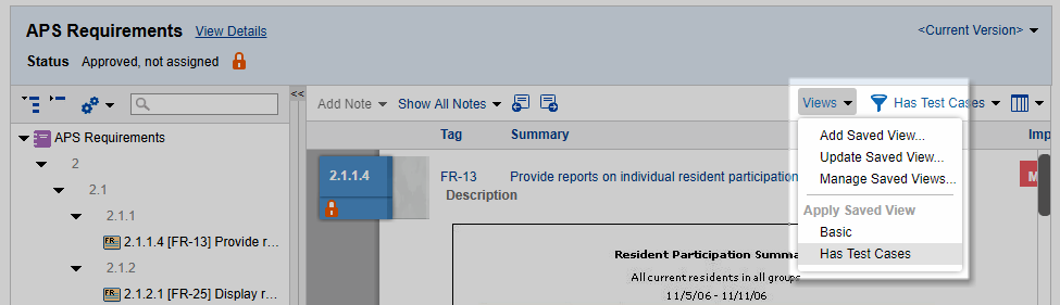Note: If you make changes to the columns or filter in a saved view you own, you can update it to save the changes. See Updating saved requirement document views.