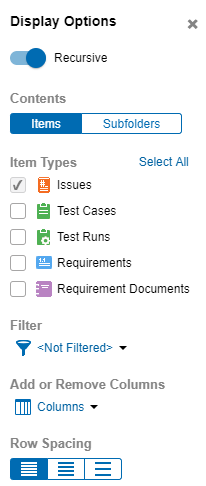 Select the item types to display in the list. Click Select All to select all item types. You must select at least one type. These options are not available if a test case or manual test run suite folder is selected.
