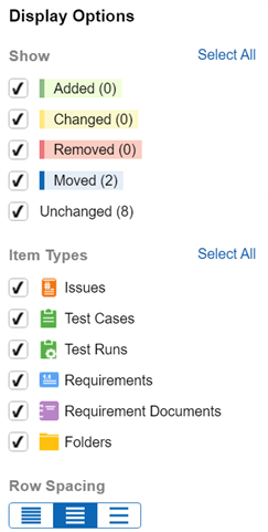 Note: The following information applies to viewing differences for folders in baselines. See Viewing differences between items in baselines for information about viewing issues, requirement, test cases, and manual test run differences, or Viewing differences between requirement documents in baselines for information about viewing document differences.