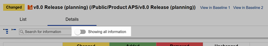 When you are comparing two baselines, you can view differences for a specific folder in the baselines. You can see detailed changes made between the baselines, such as changes to fields and release planning information.