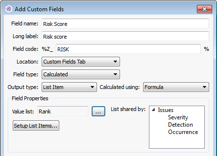 Calculated list item fields can return list values mapped to calculation results, such as risk level based on selected values for issue severity and occurrence. These fields can use either a formula or the table lookup method to return values.