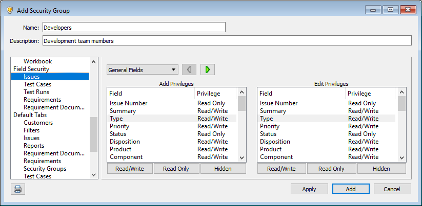 You can also set different field security for when users add and edit items. For example, you can set the Add privilege for the Type field to Read/Write and the Edit privilege to Read Only to let users set the field value when adding items and prevent them from changing the value when editing items.