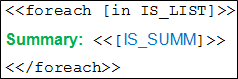 | <<foreach [in IS_LIST]>> | <<[field_code]>> | <</foreach>> |