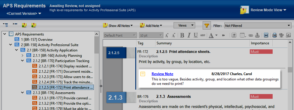 When you review a requirement document, you can add review notes to provide feedback about the entire document and individual requirements in the document. For example, add a document review note if a change affects the structure of the document or add a requirement review note to indicate a specific change needed in a requirement.