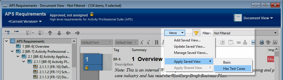 Note: If you make changes to the columns or filter in a saved view you own, you can update it to save the changes. See Updating saved requirement document views.
