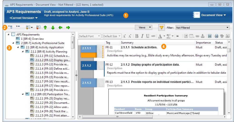 Requirement documents display requirements in a hierarchical outline format. Depending on your role, you may modify documents to change the content or only review documents to provide feedback.