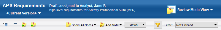 Use the Review Mode toolbar to navigate and add review notes to requirements or the document.