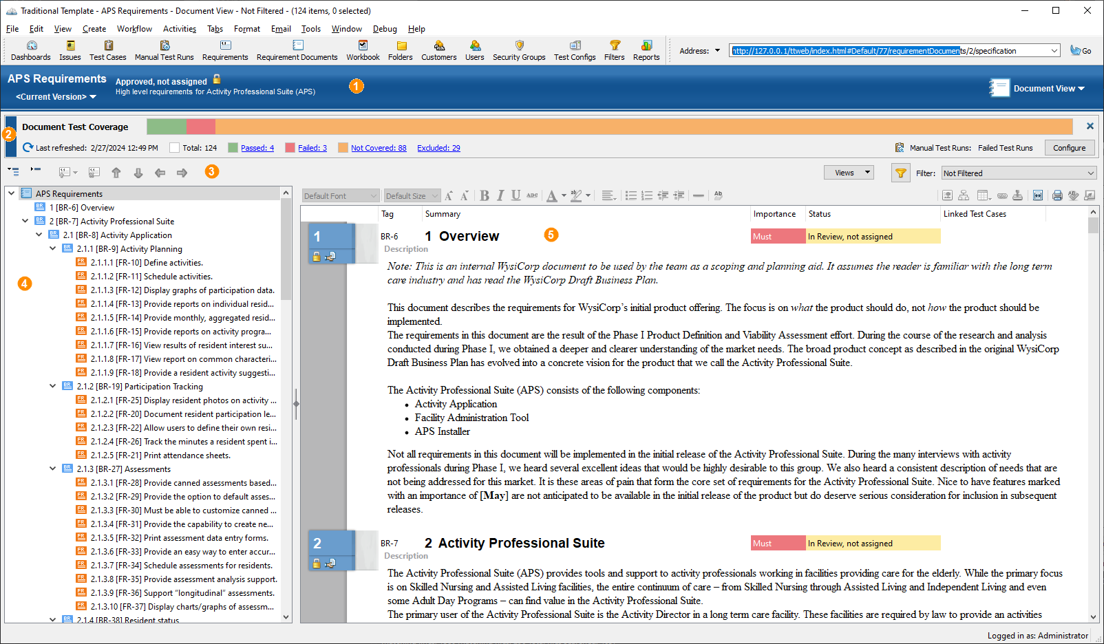 Requirement documents display requirements in a hierarchical outline format. Depending on your role, you may modify documents to change the content or only review documents to provide feedback.