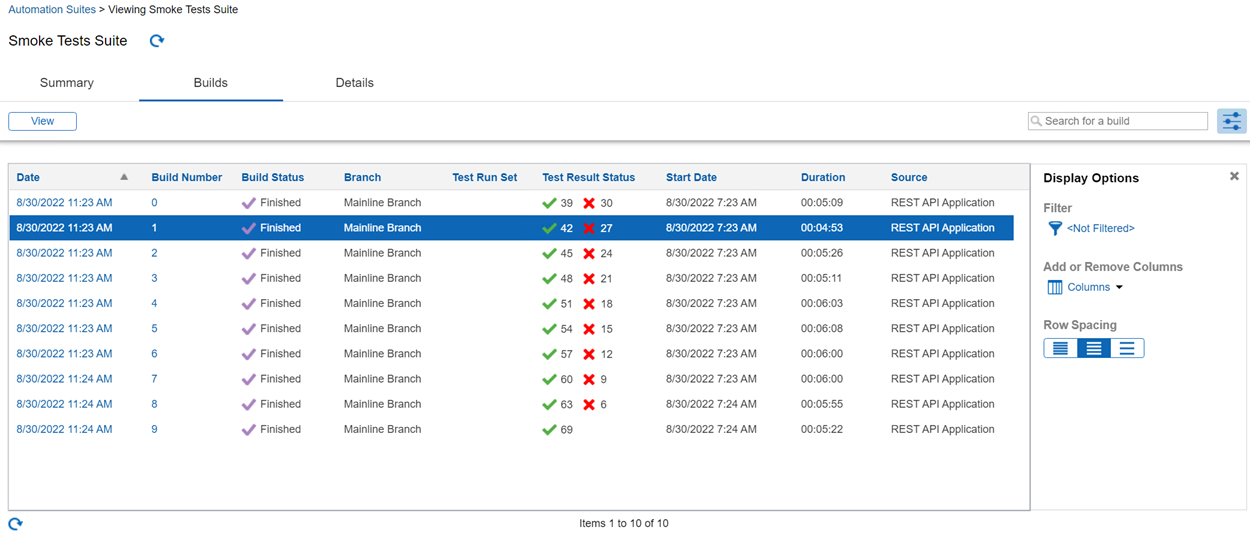 A build represents a group of automated tests run in an automated testing tool. You can view a summary of builds in an automation suite for a quick view of build status, the status of tests run from the build, and other basic information about the build. You can also drill down to view more detailed information about a specific build. See Viewing builds.
