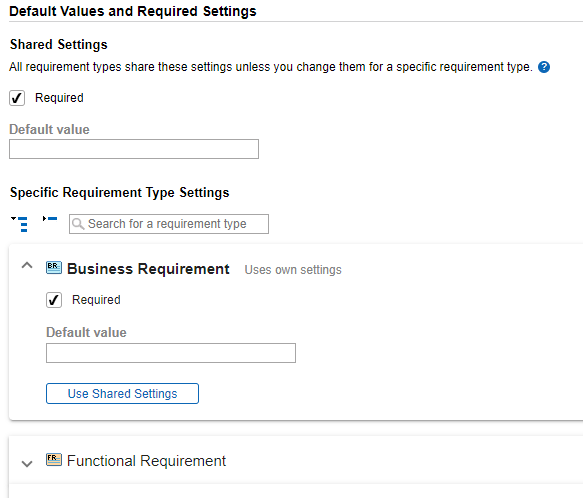 To override the Shared Settings and use different settings for a specific requirement type, make changes to the Specific Requirement Type Settings.