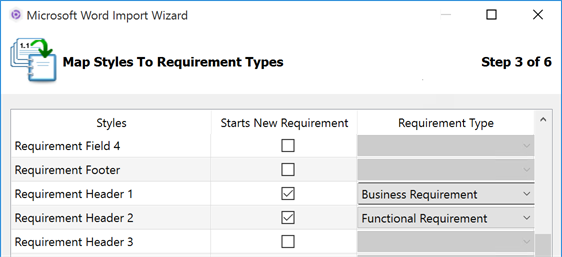 This method does not offer as much flexibility as using styles because you can only choose one default requirement type for all requirements and you cannot control which requirements are imported. However, you can change the individual requirement types and remove requirements you do not want to import when you preview the import.