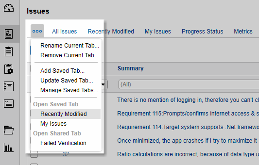 You can only open a tab in the list it was created for. For example, you cannot open a Requirements list tab in the Issues list.