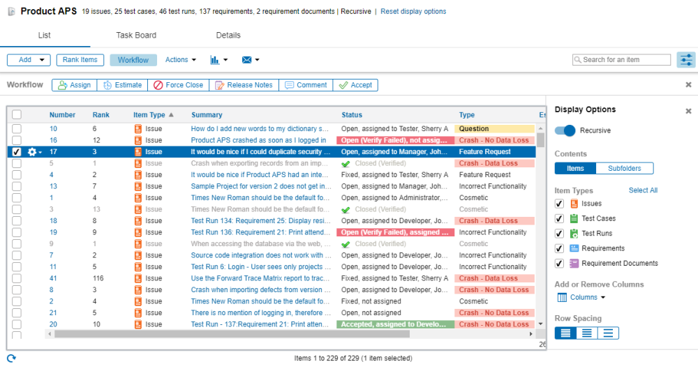 Select the item types to display in the list. Click Select All to select all item types. You must select at least one type. These options are not available if a test case or manual test run suite folder is selected.