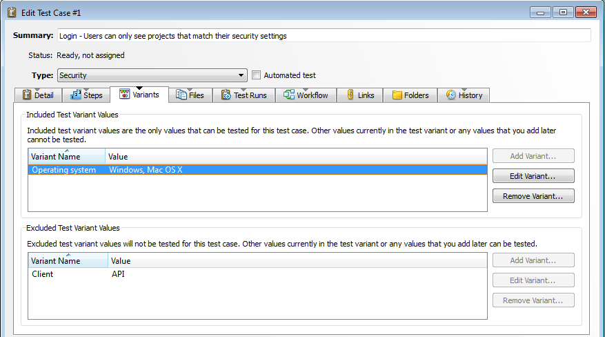 Test variants, which are attributes of the tested application used to generate test runs, allow you to create multiple test runs from a single test case to support multiple configurations. For example, if you are testing a cross-platform application, you can create a test variant named Operating System and include each platform as a test variant value. A test run is created for each unique combination of test variant values that are selected when test runs are generated.