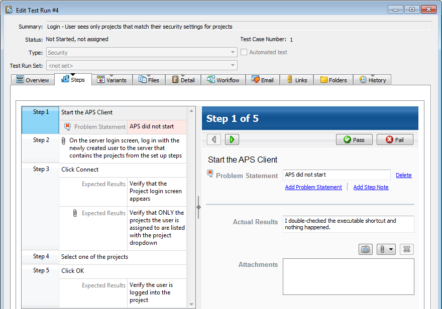 - A problem statement is required for each step that fails. Problem statements indicate that an issue occurred during the test and are used when creating issues from test runs. Testers must enter a problem statement if they indicate that a step failed before a test run is saved.