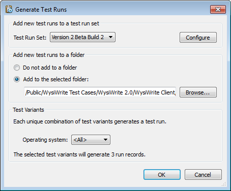 In addition to using test run sets, add test runs to test run suite folders to organize them. The following screenshot shows the Generate Test Runs dialog box, which is used to generate and organize new test runs.