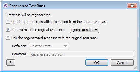 The following screenshot shows the Regenerate Test Runs dialog box, which is used to set options for regenerated test runs.