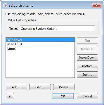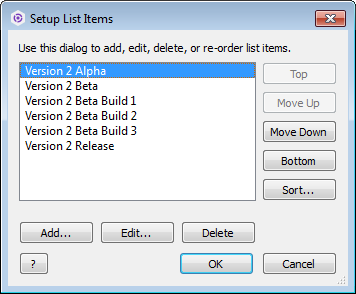 The following examples show the Setup List Items dialog box, which is used to configure test variants and a test case with test variants used and not used when generating test runs.