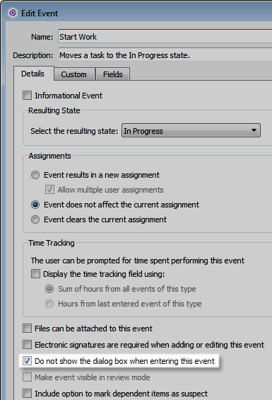 If possible, consider eliminating user prompts from workflow events. To do this, select Do not show the dialog box when entering this event in the Edit Event dialog box in the workflow configuration. This helps users move cards between columns as quickly as possible and ensures that users are only prompted to enter more information when required by your process.