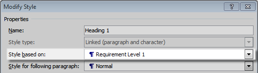 3. Base the styles you are using for the requirement summary text on the corresponding Requirement Level styles. For example, if you use Heading 1 and Heading 2 styles, base Heading 1 on Requirement Level 1 and Heading 2 on Requirement Level 2.