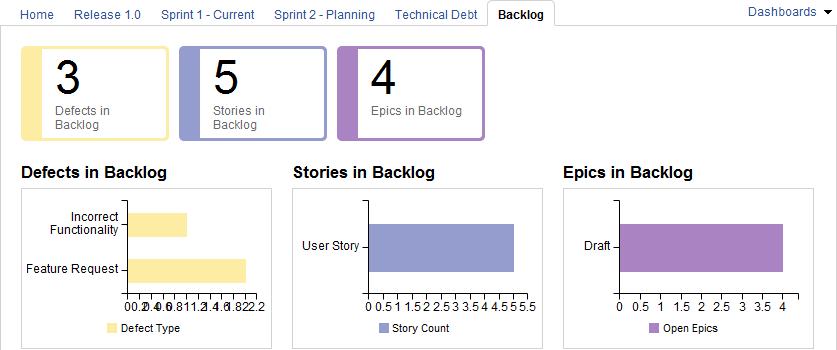 Use to quickly access backlog items and view the defect types, user story counts, and open epics in the backlog.