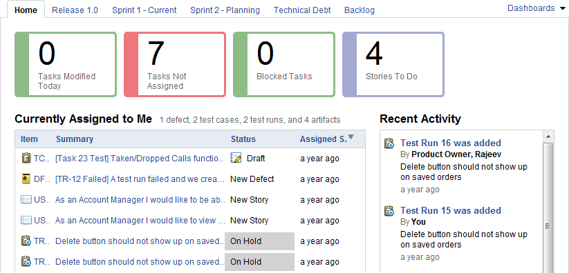 Use Helix ALM dashboards to immediately know more about your project, including what needs your attention, key project metrics, and other important activity. Dashboards include configurable widgets that let you view project information at a glance and help you do more with quick access to your work items and tasks.