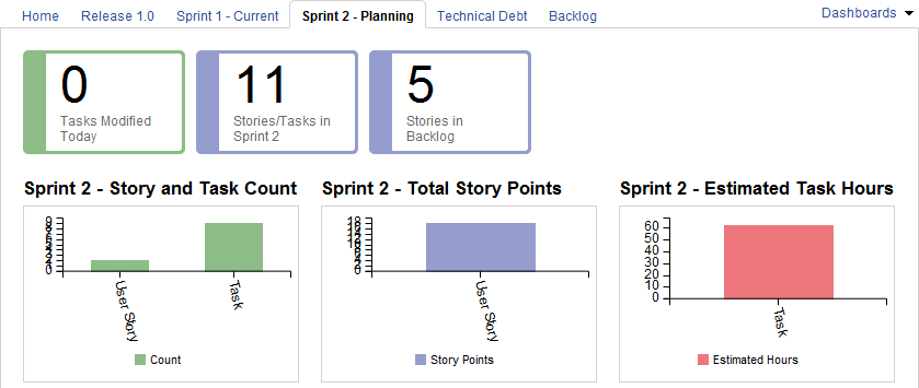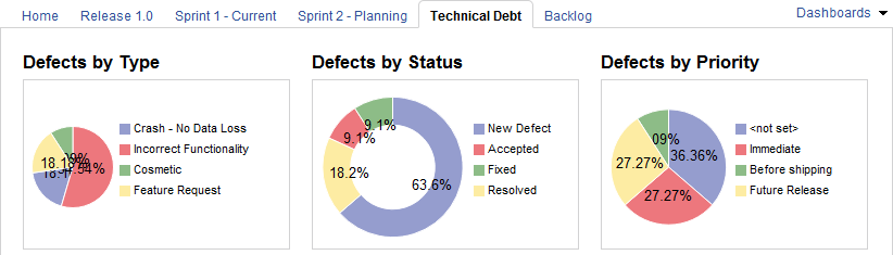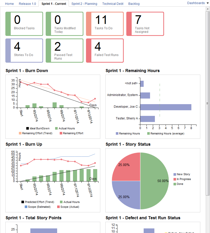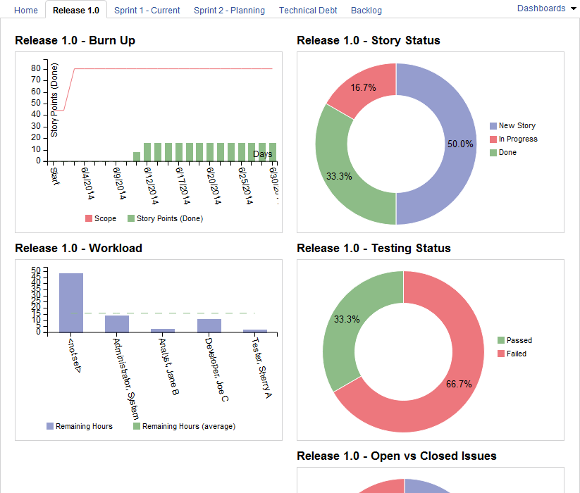Use to track information for the 1.0 release, including the story points done (burn up status), story status, workload distribution, testing status, and open vs. closed defects.