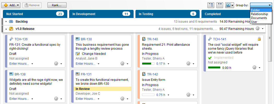 Swimlanes group items horizontally in the task board by folder, user, relationship, or requirement document depending on the configuration. The swimlanes used depend on the option selected in the Group by list on the task board. See Changing task board swimlane groupings for information about each swimlane type.
