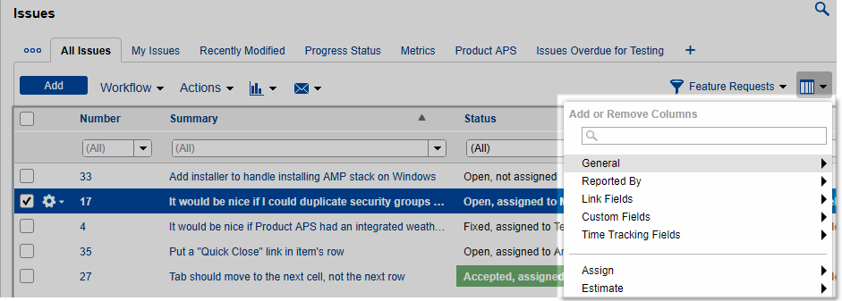 You can add and remove columns in item lists. To add and remove columns in the Filters and Reports lists, see Changing Filters list display options and Changing Reports list display options.