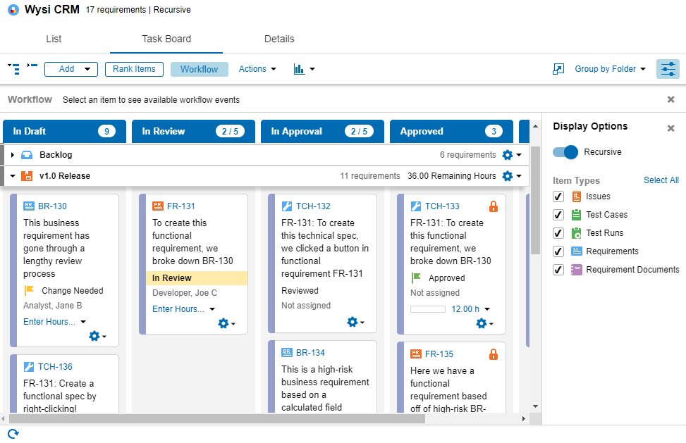 Swimlanes group items horizontally in the task board by folder, user, relationship, or requirement document depending on the configuration. The swimlanes used depend on the option selected in the Group by list on the task board. See Changing task board swimlane groupings for information about each swimlane type.